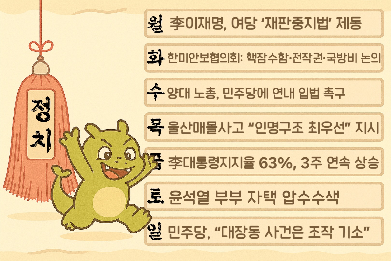 정치 분야에서는 이 대통령이 여당의 '재판중지법' 추진에 제동을 걸고 '정쟁 중단과 국정 집중'을 요구하며 3주 연속 지지율 상승(63%)이라는 외교 성과를 지키려 했습니다.